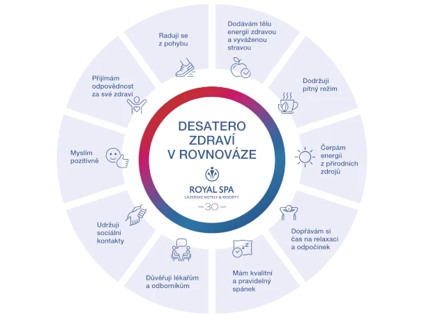 VODA, DOTEK, MYSL, AKTIVITA, VÝŽIVA a RELAXACE – základní elementy našeho kruhu zdraví představují lidské potřeby, které dokonale vystihují filozofii lázeňské péče v našich hotelech a resortech ROYAL SPA. Naším cílem je rovnováha vašeho zdraví.